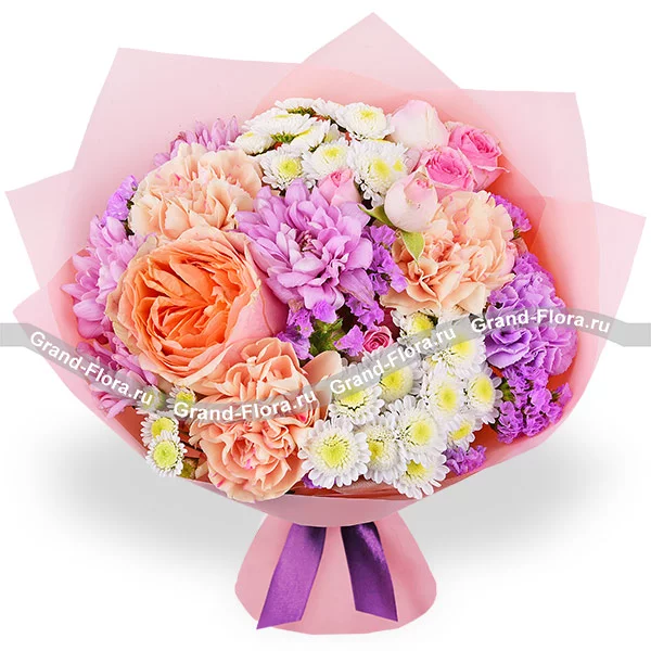 Уменьшенный: роза персиковая - 1 шт.,гвоздика персиковая - 3 шт., гвоздика фиолетовая - 1 шт., роза кустовая розовая - 1 шт., роза кустовая фиолетовая - 1 шт., хризантема кустовая ромашковая фиолетовая - 1 шт., хризантема сантини - 1 шт., статица, упаковка, лента. Примерный размер: 25Х25 см.